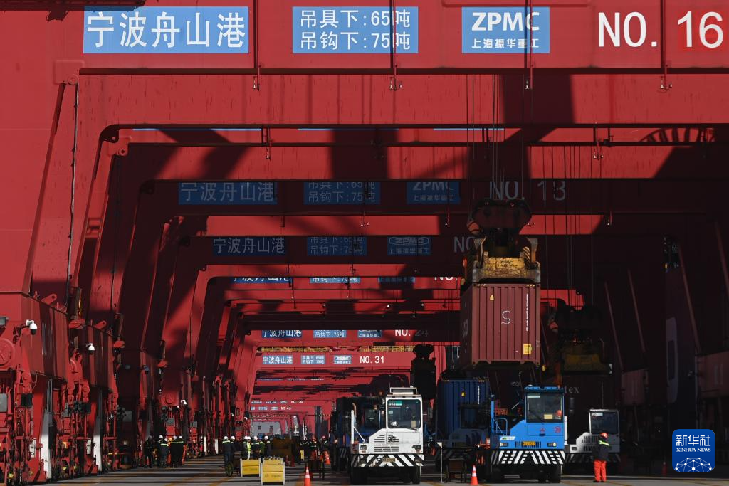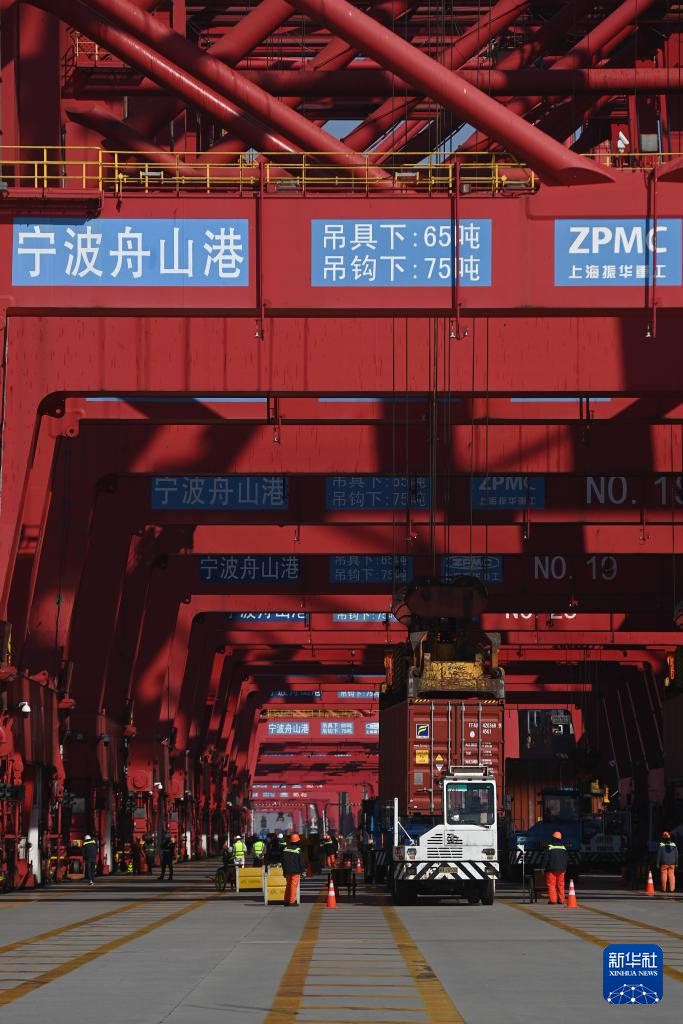 1月24日,卡车在宁波舟山港梅山港区装卸。