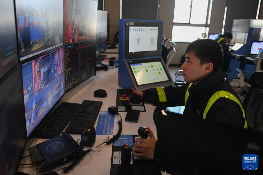 1月24日,宁波舟山港梅山港区的桥吊司机在操作远程控制桥吊系统。