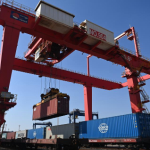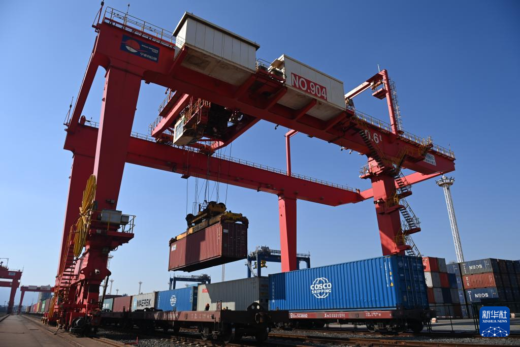 1月24日,在宁波舟山港铁路北仑港站,龙门吊在装卸海铁联运班列的集装箱。