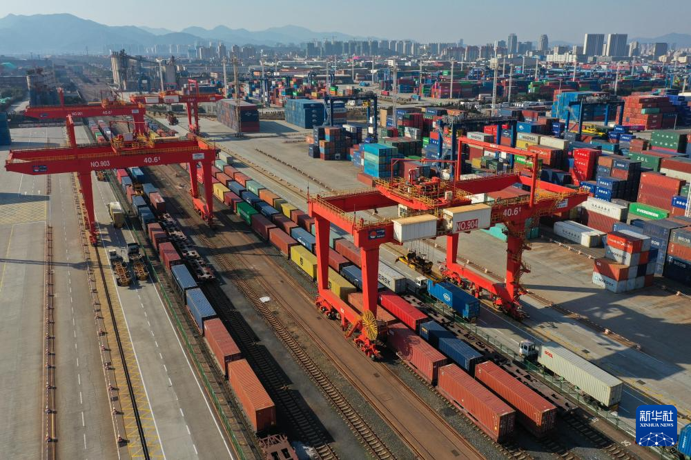 在宁波舟山港铁路北仑港站,龙门吊在装卸海铁联运班列的集装箱(1月24日摄,无人机照片)。