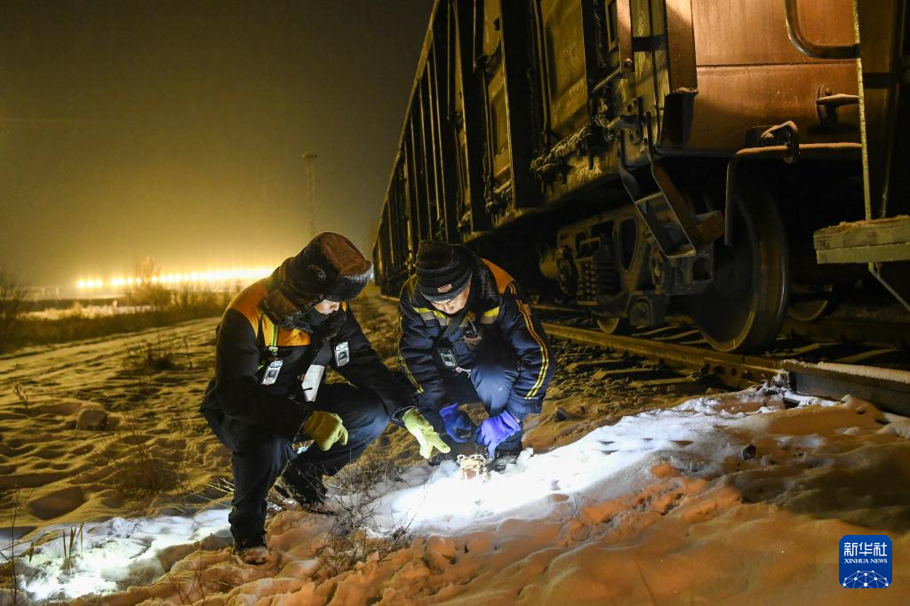 在霍尔果斯铁路口岸,库尔肯(左)和同事一起检查工具(1月16日摄)。