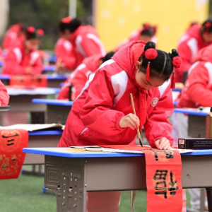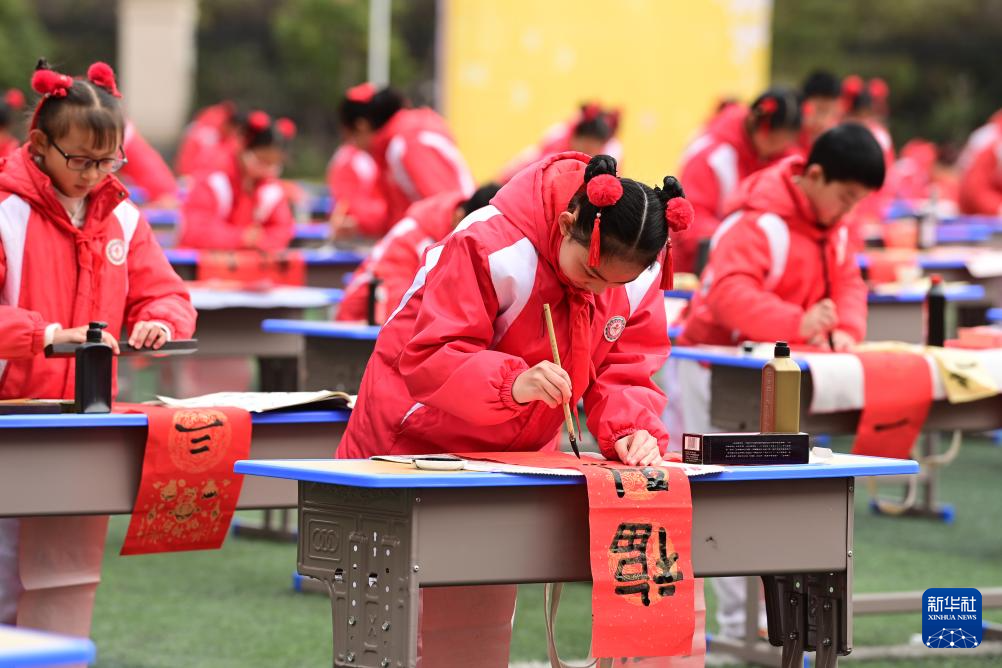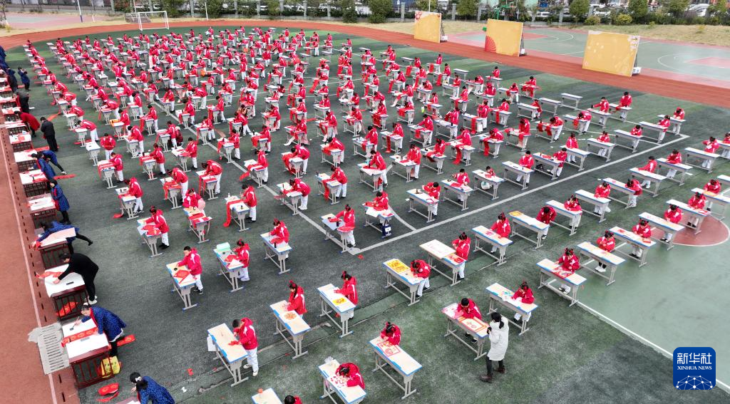 当日,江西省赣州市文清路小学举行师生集体写春联迎新春活动,学校师生在操场上挥毫泼墨,书写春联,迎接新春佳节。