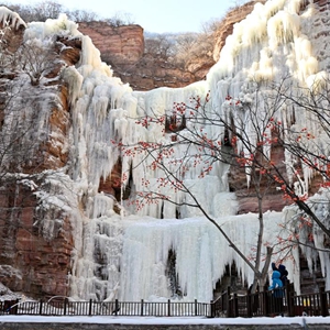 寒冬时节,河北省石家庄市赞皇县嶂石岩景区冻凌背瀑布出现冰瀑美景,形态各异的冰柱悬挂在山间,吸引不少游客前来观赏。