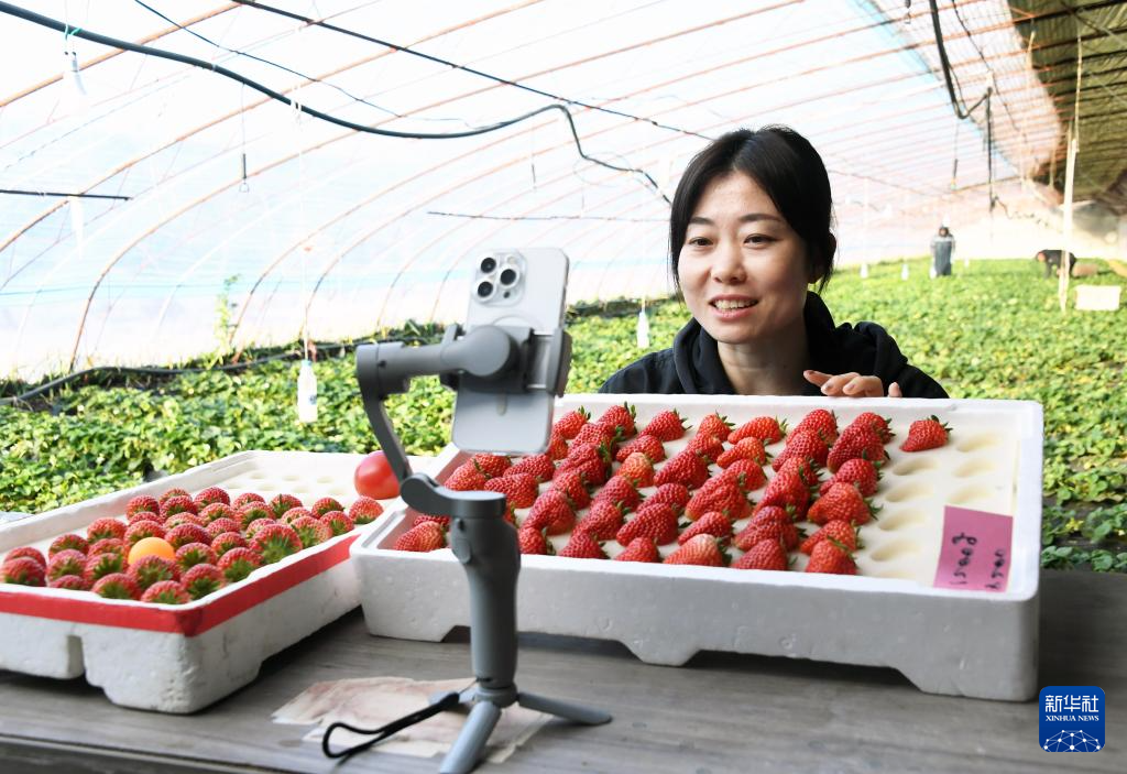 1月25日,在北京市平谷区马坊镇北京绿养道农产品产销专业合作社大棚,工作人员通过视频直播的方式销售草莓。