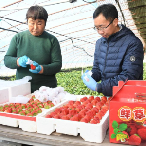 近期,北京市平谷区马坊镇草莓种植大棚中的草莓进入成熟期,当地果农采摘分拣草莓,供应春节市场。