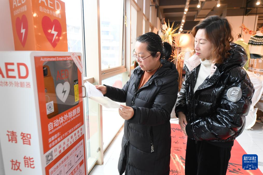 1月26日,建德市卫健局工作人员(左)在商场内查看AED维护记录。