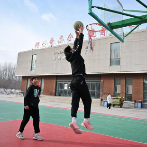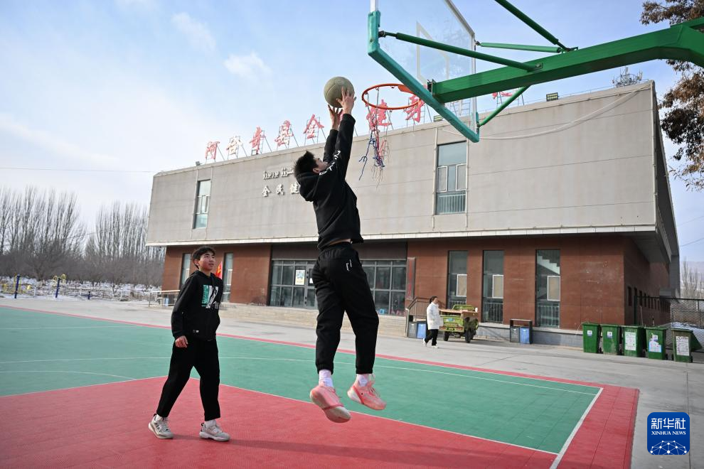 1月26日,当地居民在阿合奇县县城一处室外篮球场运动。