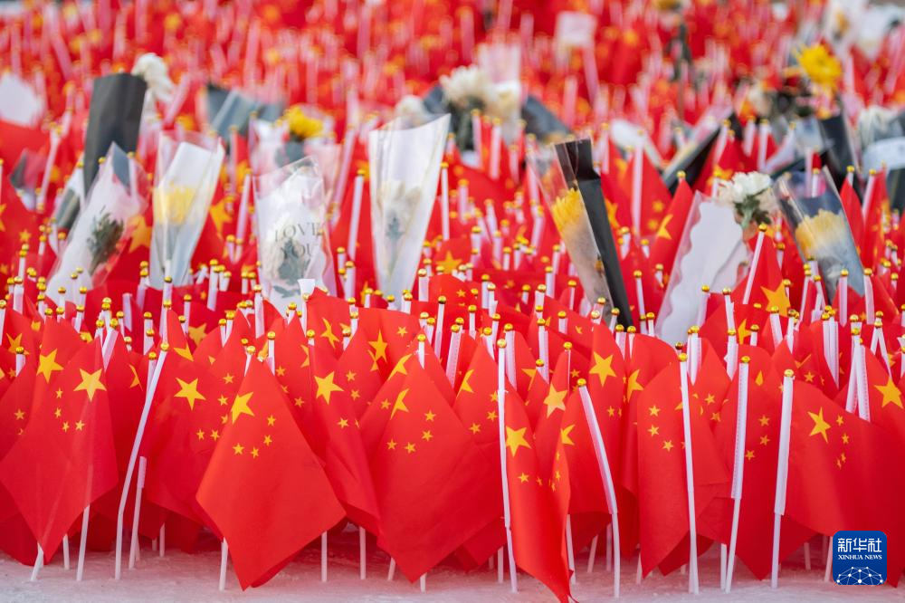 这是1月25日拍摄的游客在侵华日军第七三一部队遗址的一片雪地中所插的国旗和鲜花。
