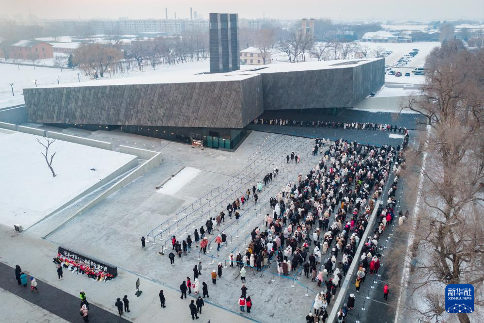 1月25日,游客在侵华日军第七三一部队罪证陈列馆入口排队等候参观(无人机照片)。