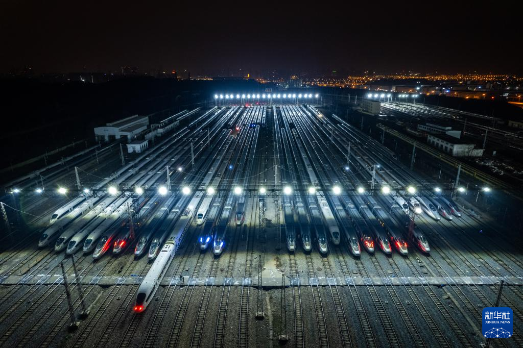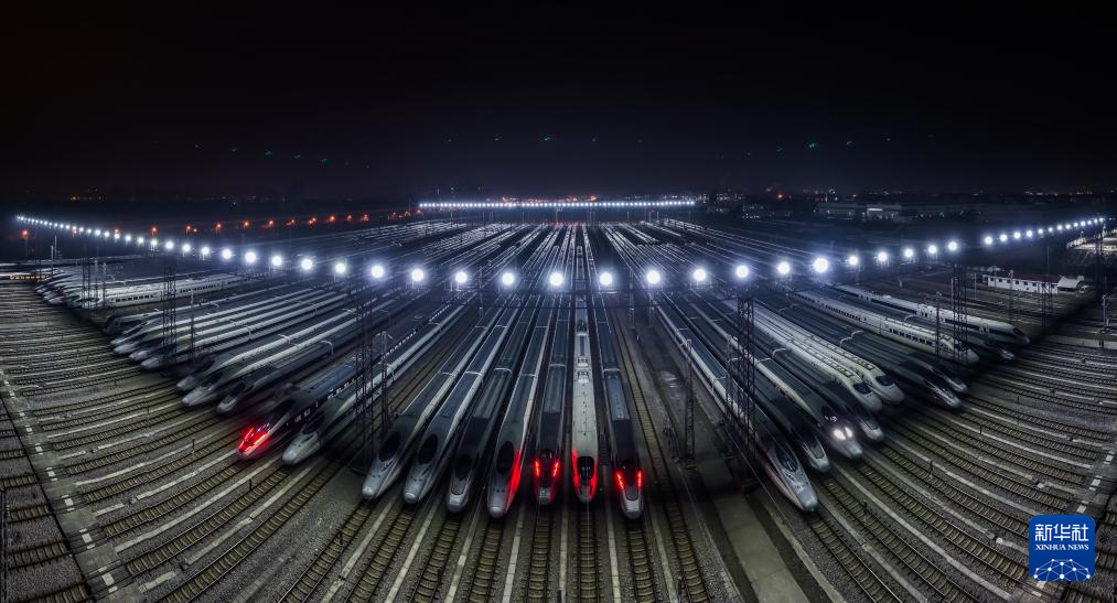1月26日,2024年春运拉开序幕。深夜,在各地动车段存车线上,工作人员通宵作业。检修完毕的动车组列车排列整齐,犹如“钢铁游龙”蓄势待发,等待黎明陆续驶出,迎接春运。