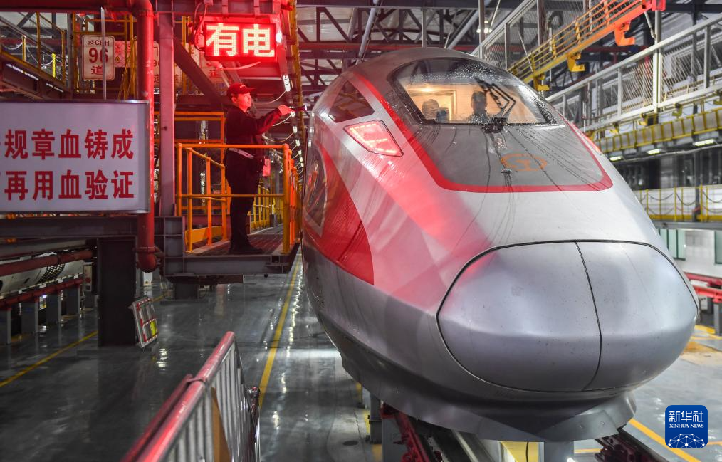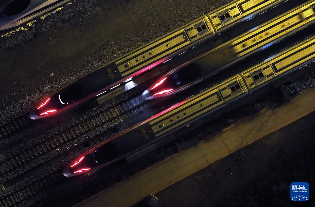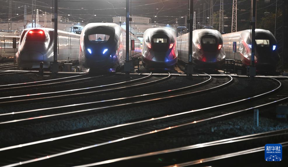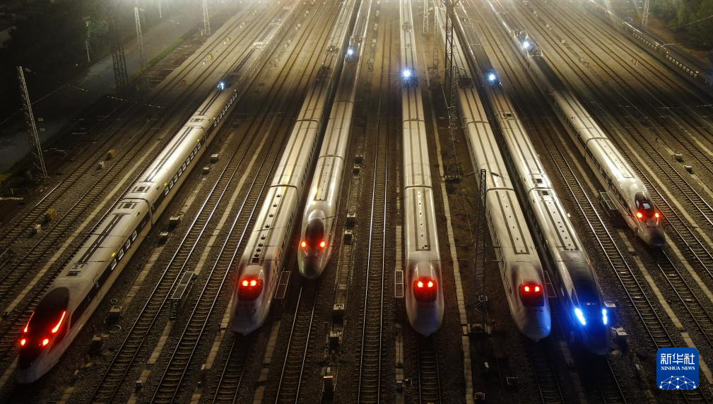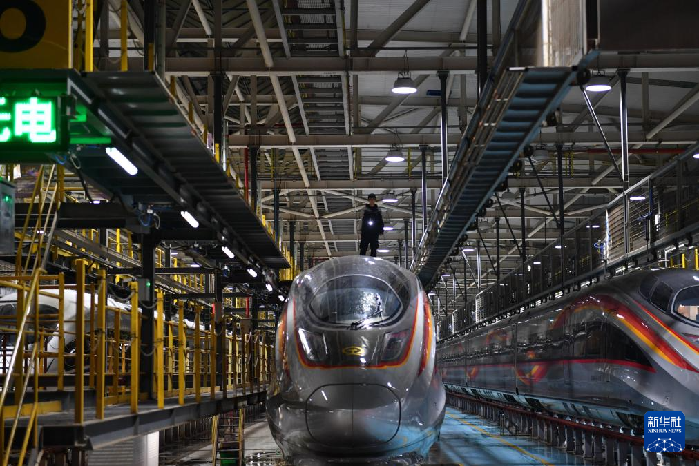 1月26日凌晨,动车组列车停放在长沙动车运用所整装待发。