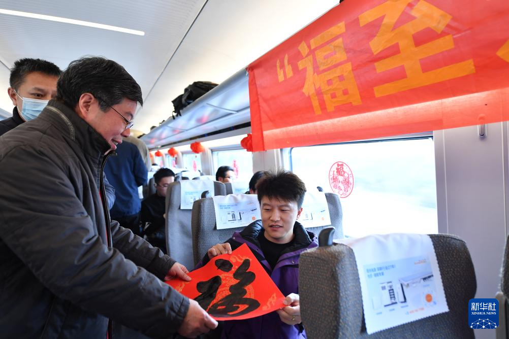 2024年春运首日,南京客运段开展“福至运来 情满旅途——书法名家送福上高铁”活动,在由南京南站发往太仓的G8981次列车上,工作人员用送“福”字、文艺表演、宣传反诈知识等方式与旅客互动。