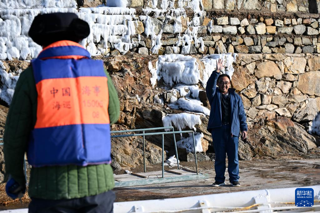 1月25日,在朝连岛守塔的史光勇在海岛码头送别物资船。