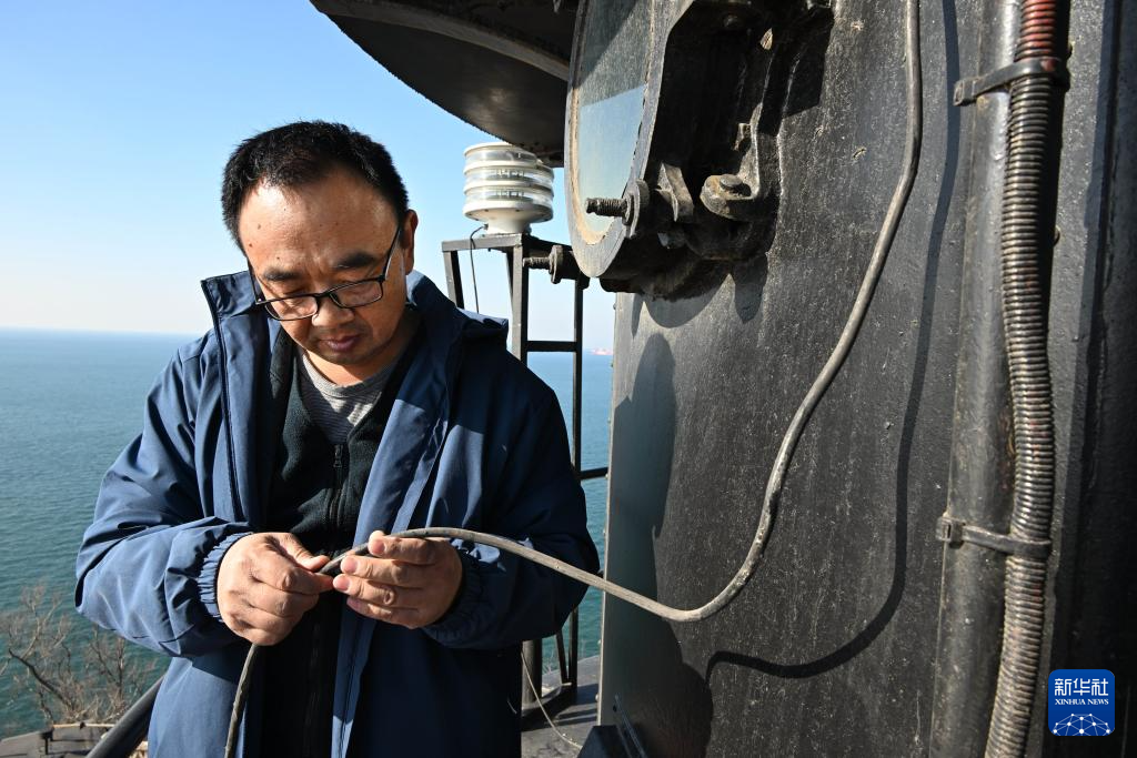 1月25日,在朝连岛守塔的史光勇在灯塔上排查线路。