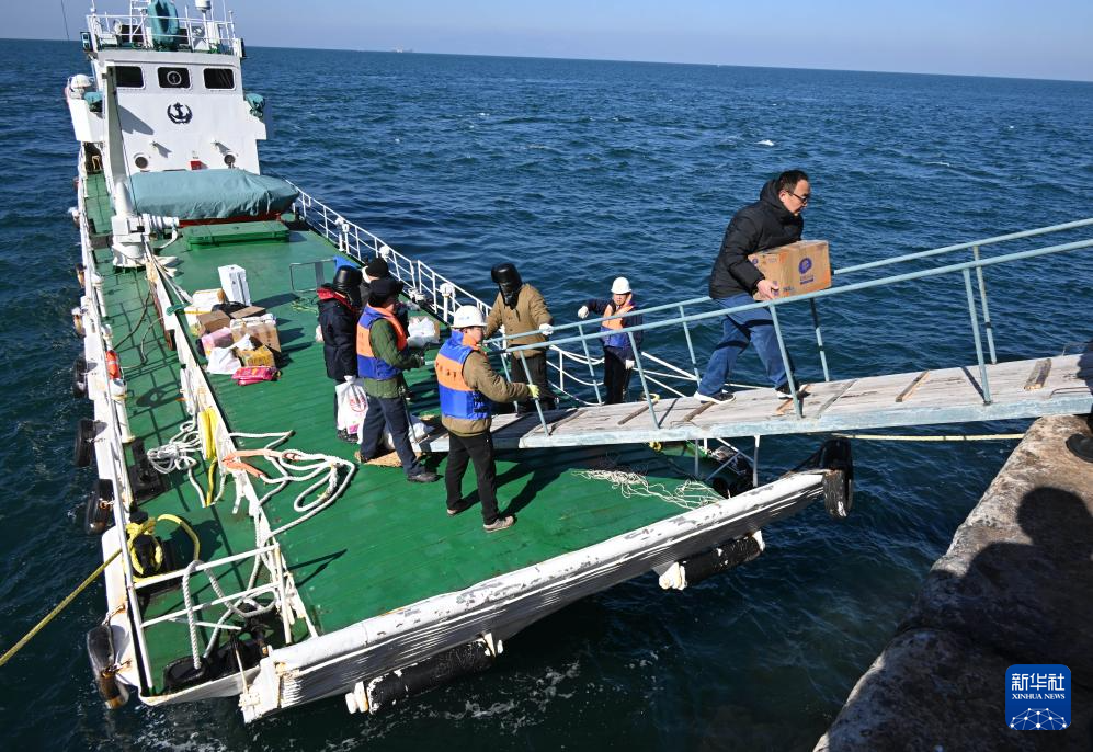 1月25日,在朝连岛守塔的史光勇(右一)搬运补给船送来的物资,这也是春节前最后一次给岛上补给。