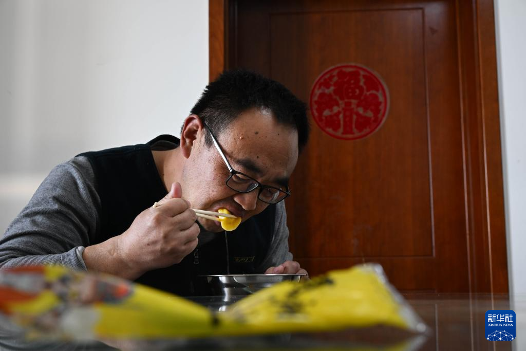 1月25日,在朝连岛守塔的史光勇在吃午餐。