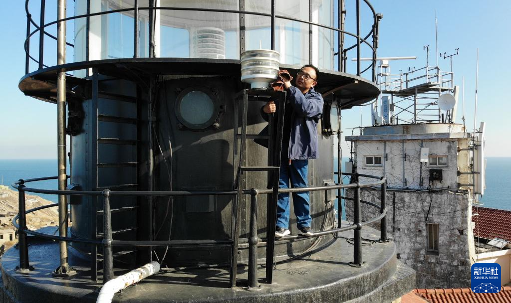 1月25日,在朝连岛守塔的史光勇在灯塔上维护航标设备。