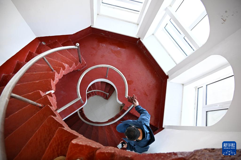 1月25日,在朝连岛守塔的史光勇小跑着奔下灯塔内的旋转楼梯。