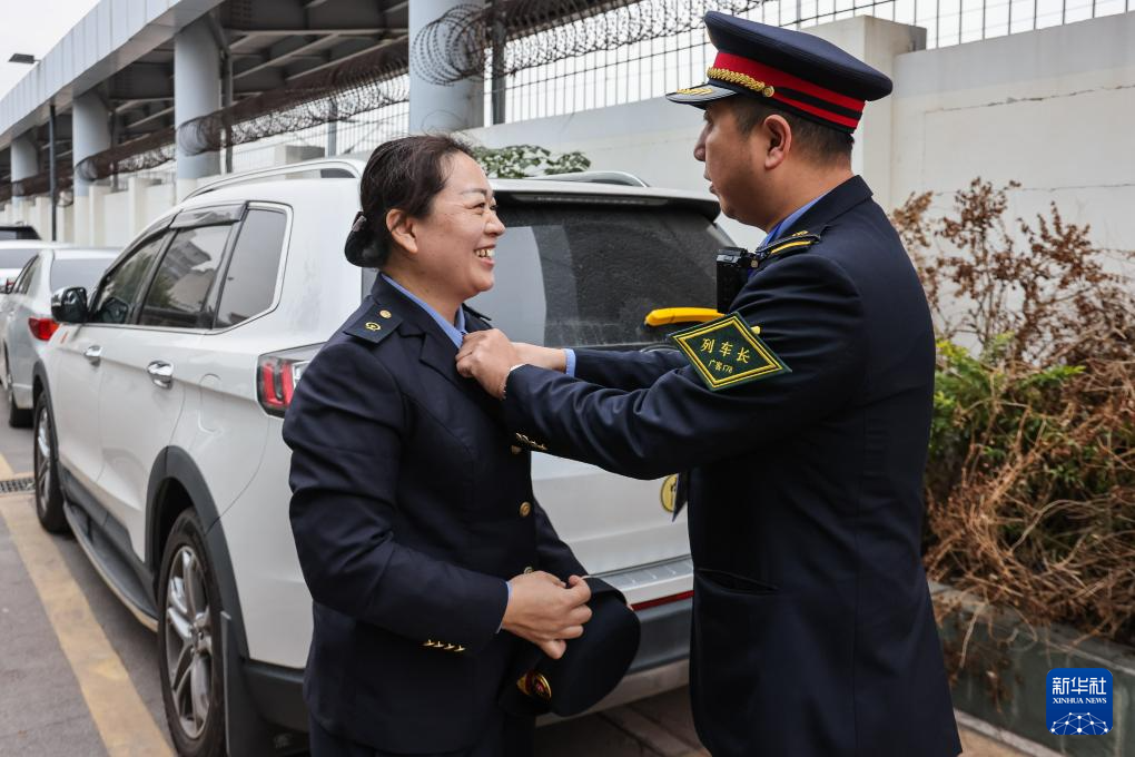1月26日,在广州客运段,张飞(右)给唐乐整理领带,夫妇俩准备出乘。