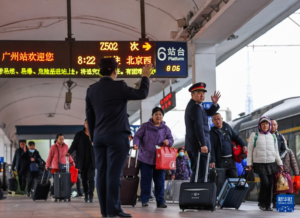 1月26日,唐乐(中)在广州站月台上叮嘱孩子们照顾好自己。