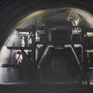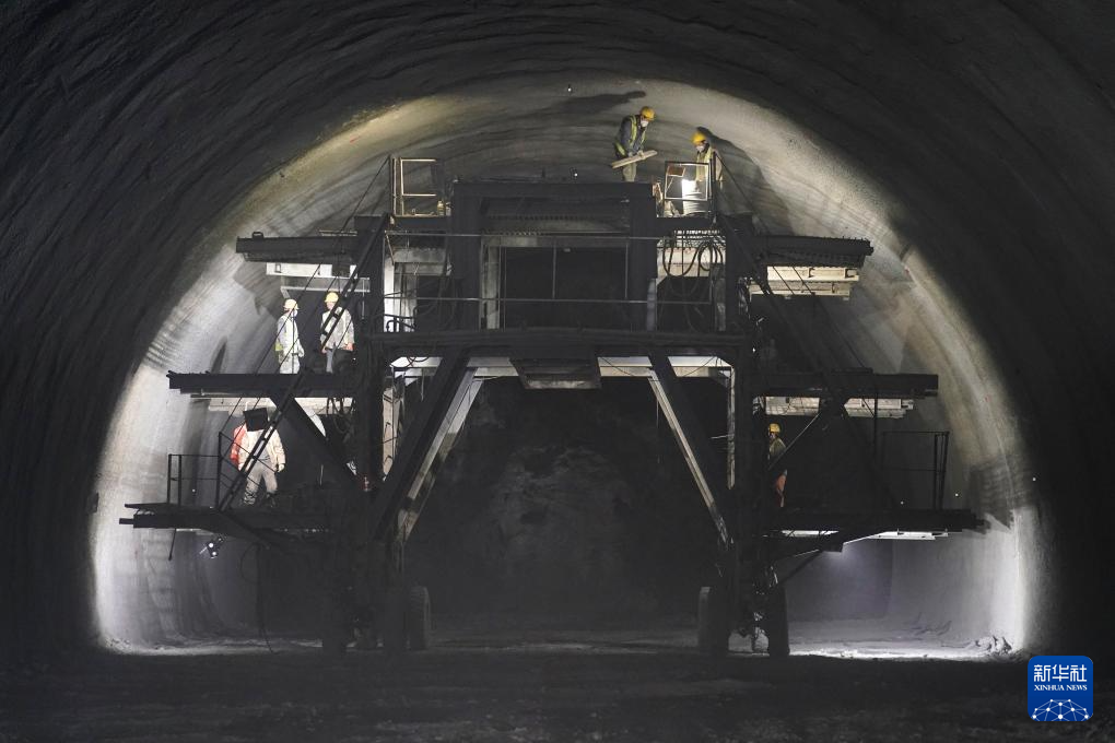 1月26日,在长达13.3公里的西康高铁秦岭九天山隧道内,中铁七局集团的工人在开挖面作业。
