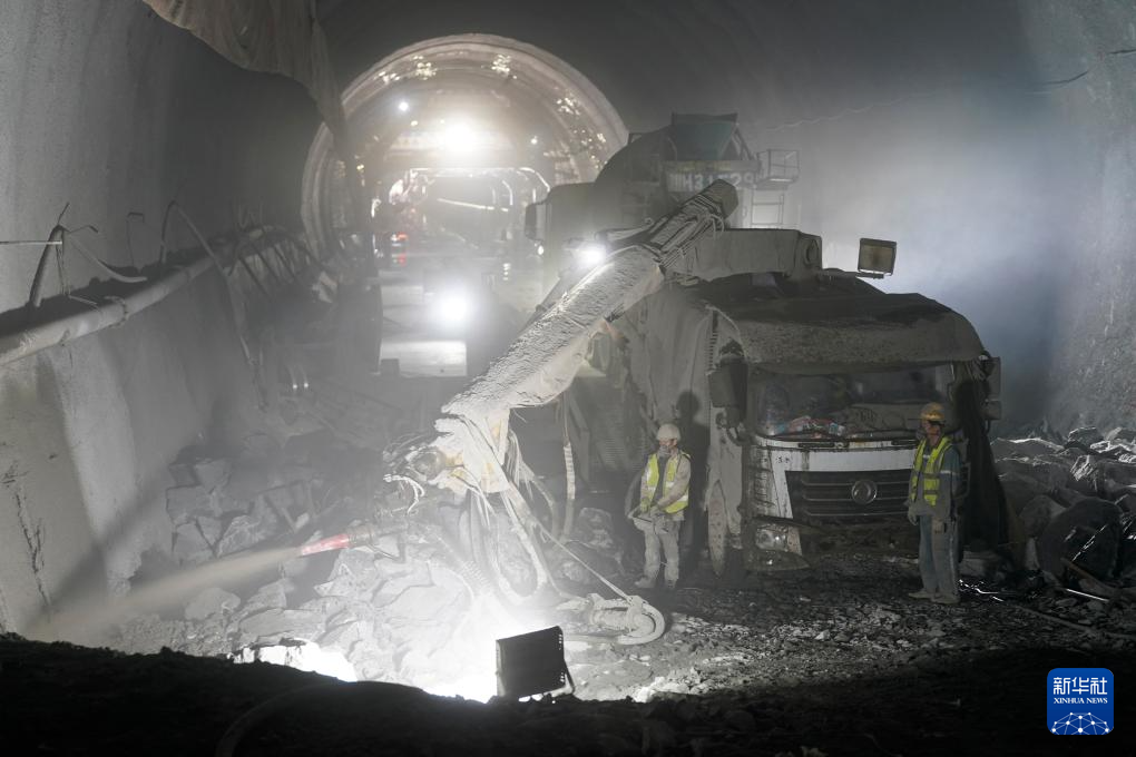 1月26日,在长达13.3公里的西康高铁秦岭九天山隧道内,中铁七局集团的工人在开挖面进行喷浆作业。