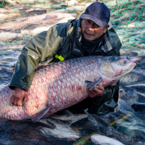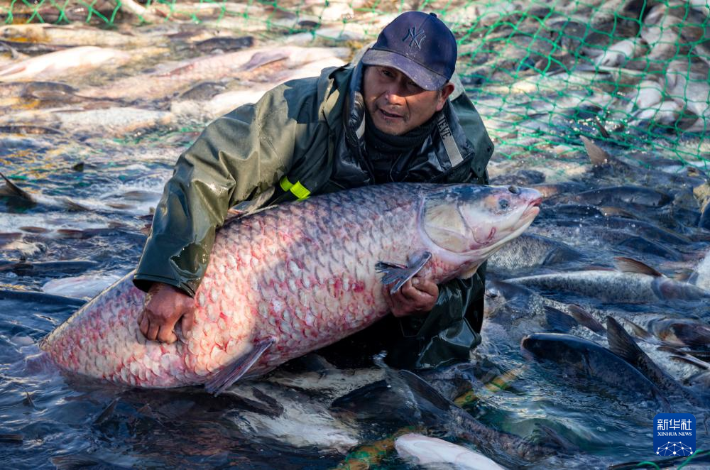 1月27日,渔民在泰州市姜堰区溱湖冬捕作业现场展示刚捕获的“溱湖鱼王”。