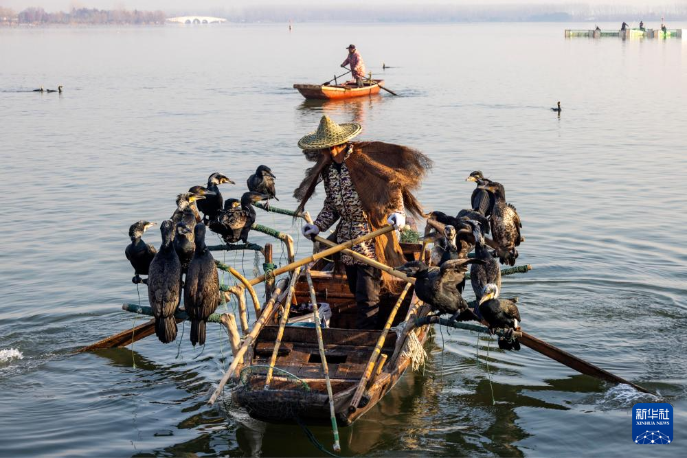 1月27日,渔民在泰州市姜堰区溱湖展示鸬鹚捕鱼。