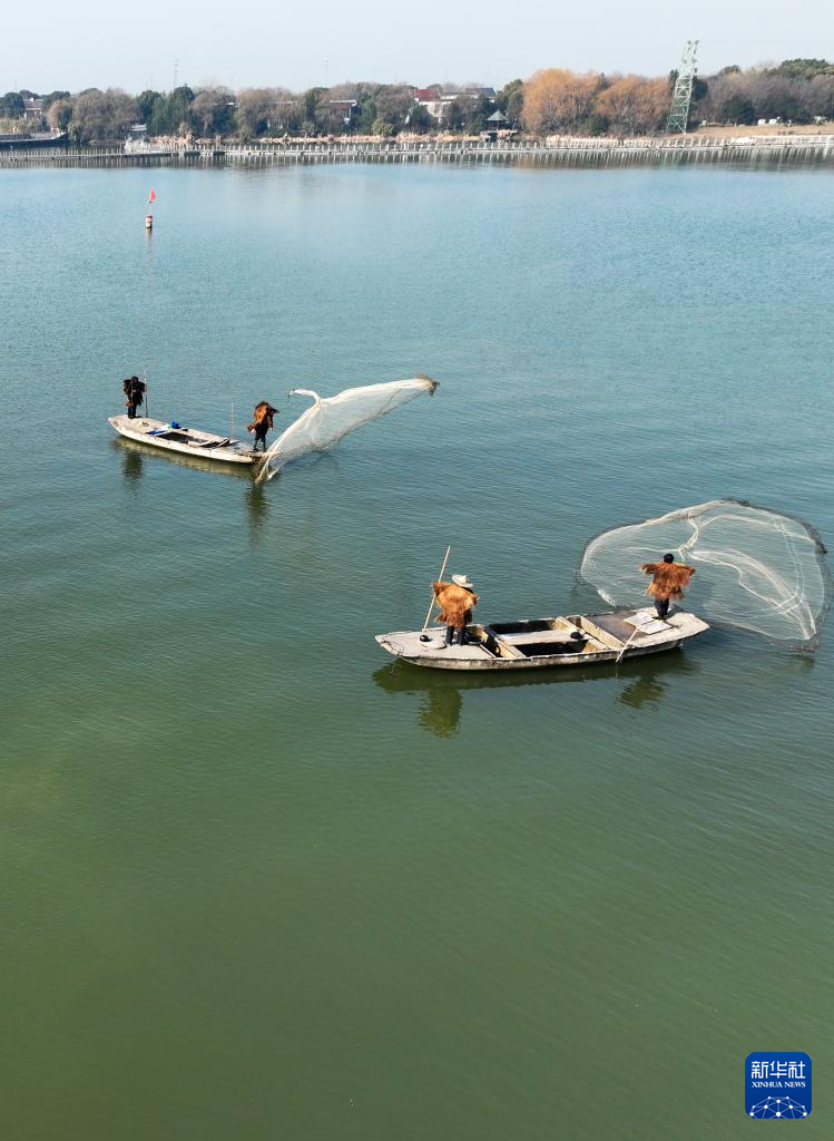 1月27日,渔民在泰州市姜堰区溱湖展示撒网捕鱼(无人机照片)。
