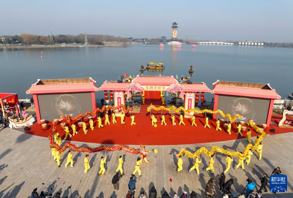 1月27日,人们在泰州市姜堰区溱湖冬捕节现场进行舞龙表演(无人机照片)。