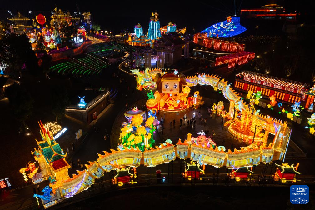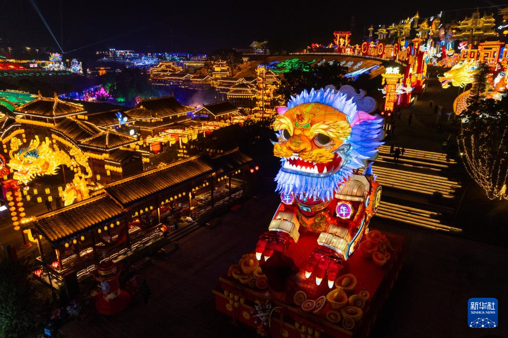 这是1月26日晚在四川省自贡市中华彩灯大世界拍摄的“年兽贺岁”灯组(前,无人机照片)。