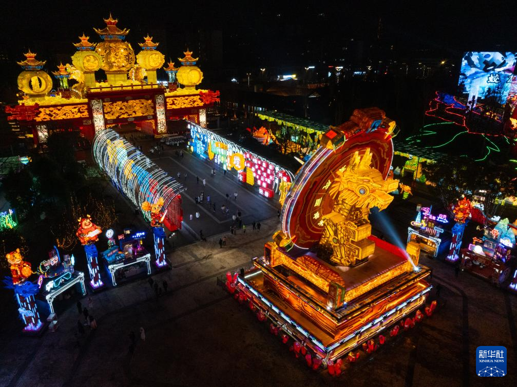 这是1月26日晚在四川省自贡市中华彩灯大世界拍摄的“文明伊始”日晷彩灯(前,无人机照片)。