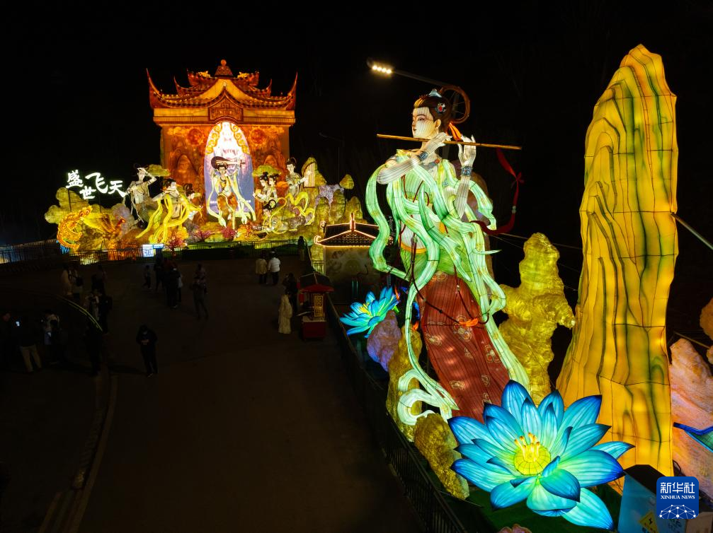 这是1月26日晚在四川省自贡市中华彩灯大世界拍摄的“盛世飞天”灯组(无人机照片)。该灯组将自贡彩灯与敦煌壁画“飞天”形象相结合,首次采用无丝工艺与传统丝架相结合的方式打造。
