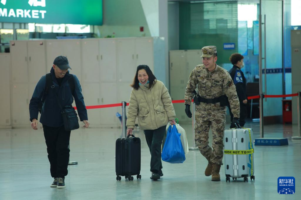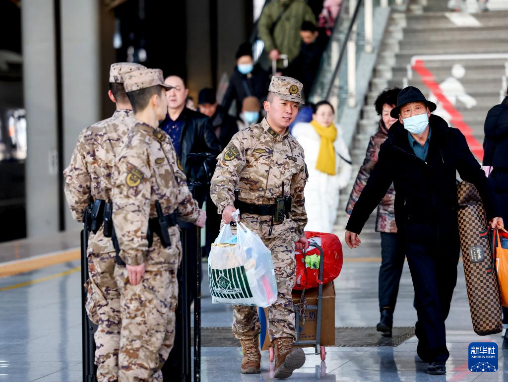 1月27日,在西宁火车站,武警青海总队西宁支队官兵为旅客提供帮助。