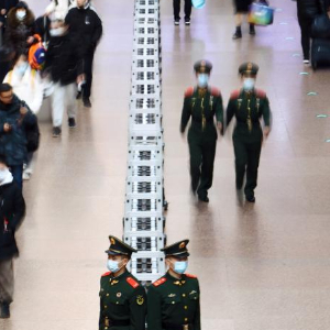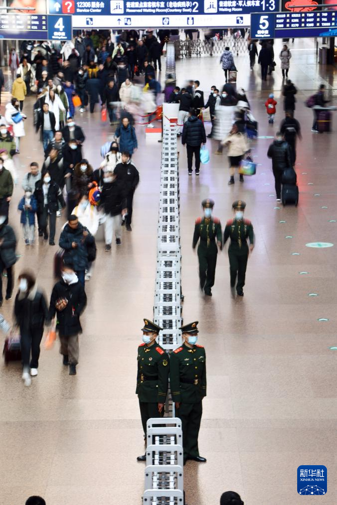 1月27日,在北京西站,武警北京总队某支队官兵在站内协助维护秩序。