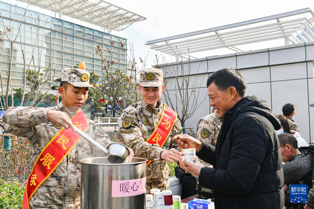 1月26日,在上海火车站,武警上海总队某支队官兵设立便民服务点,为旅客提供暖心姜茶。