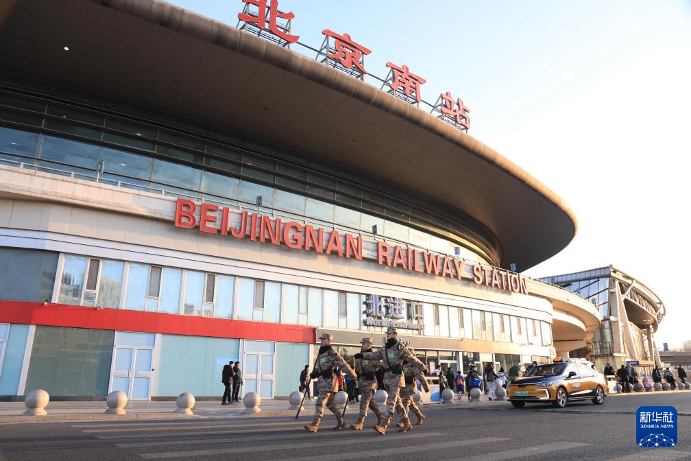 1月26日,在北京南站,武警北京总队某支队官兵执勤巡逻。