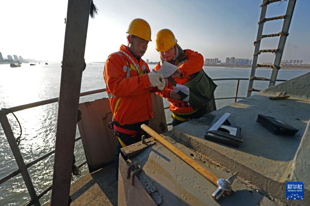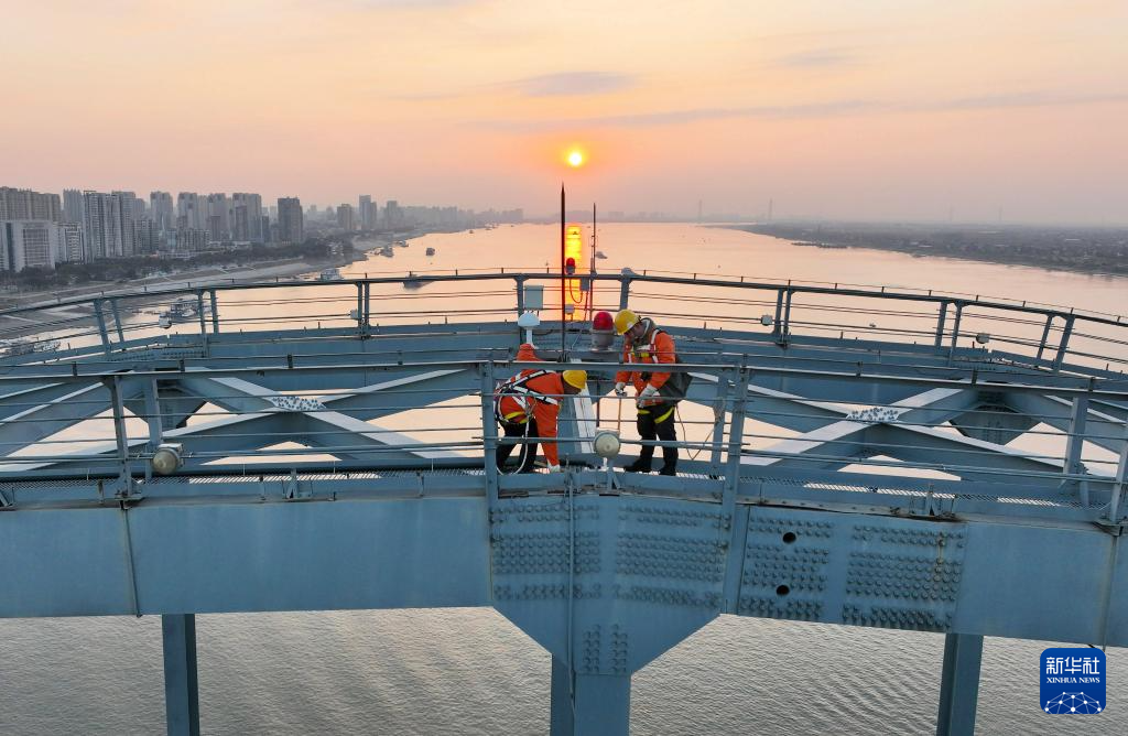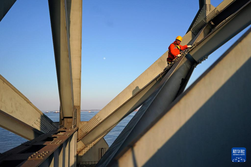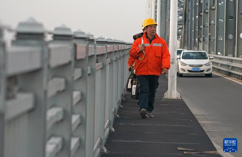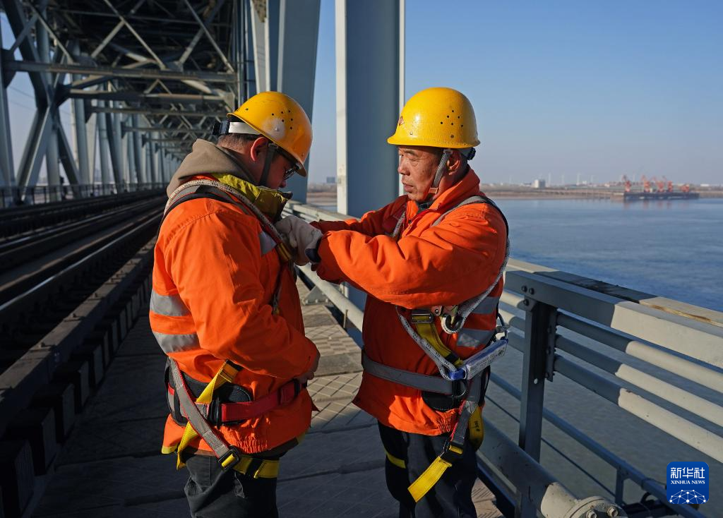 1月23日,孙凤生和工友在九江长江大桥上巡检。