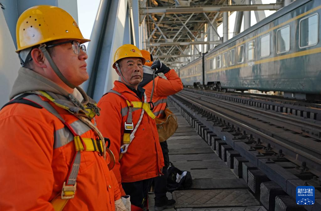 1月23日,孙凤生(中)和徒弟张文亮(左)在九江长江大桥上等待列车驶过。