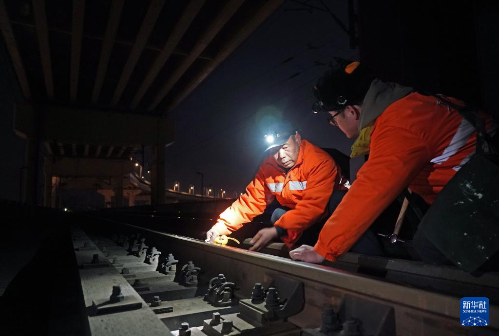 1月23日,在夜晚的铁路“天窗期”,孙凤生(左)和徒弟张文亮在九江长江大桥上测量钢轨数据。