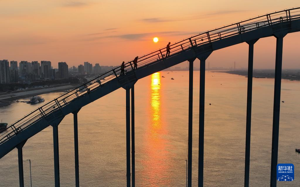 1月23日,孙凤生和工友在九江长江大桥的桥拱上巡检(无人机照片)。