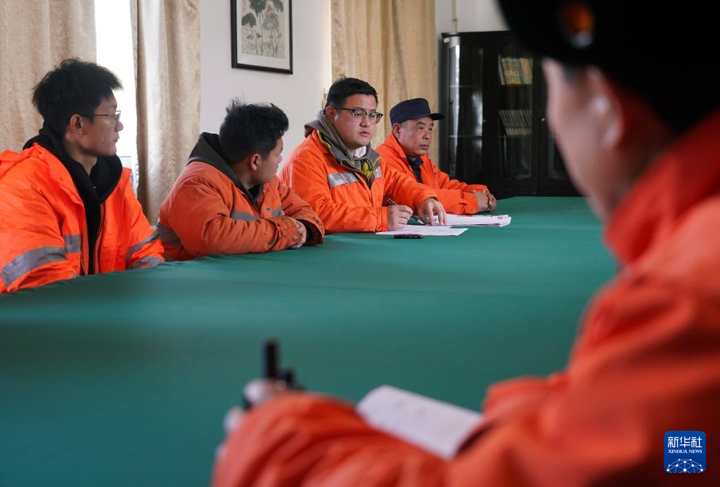 1月23日,在检修前,孙凤生(后排右一)和徒弟张文亮(后排右二)与工友一起开安全预想会。