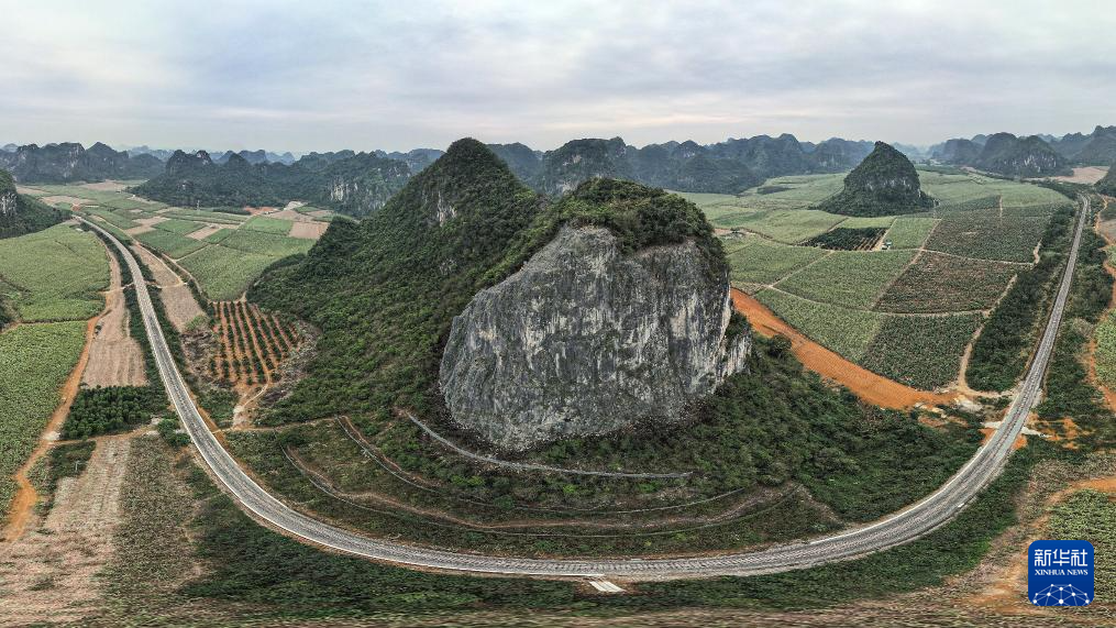 中国铁路南宁局集团有限公司的铁路工人在广西扶绥县的一处作业点搜山扫石(1月25日摄,无人机全景照片)。