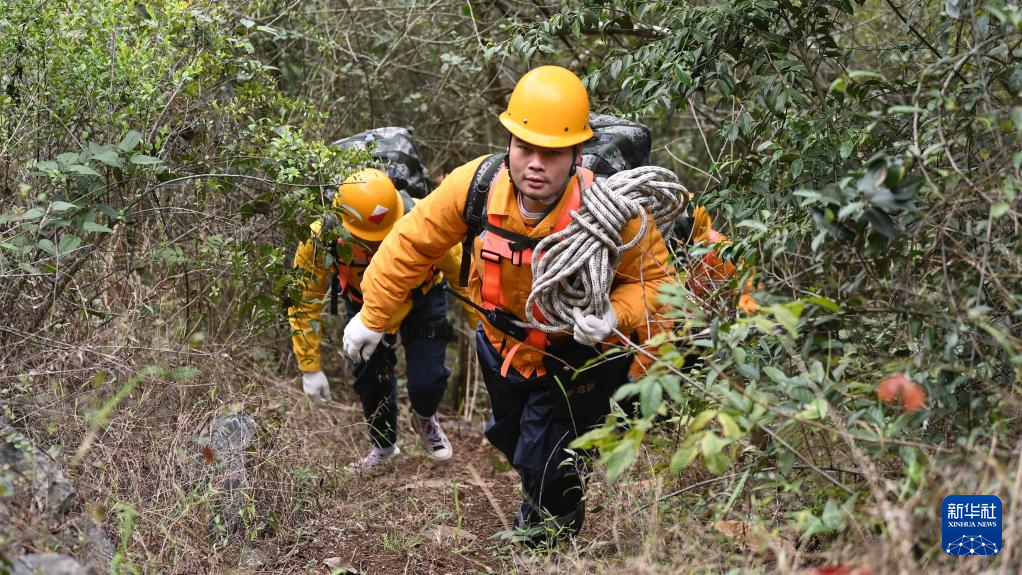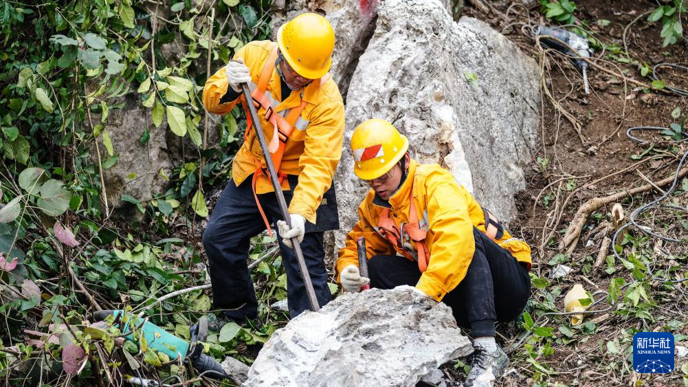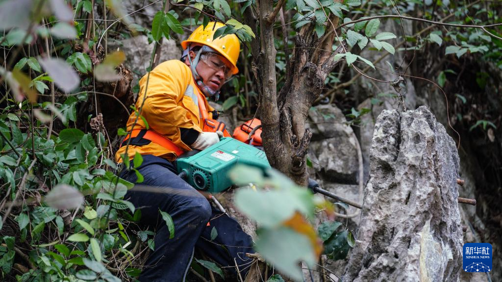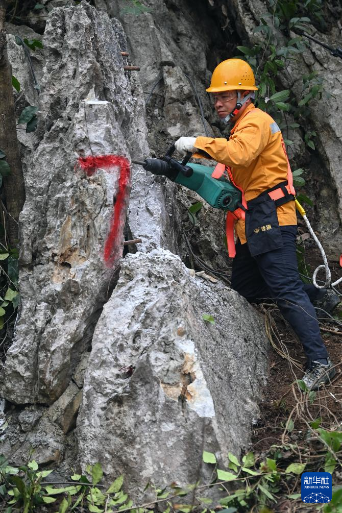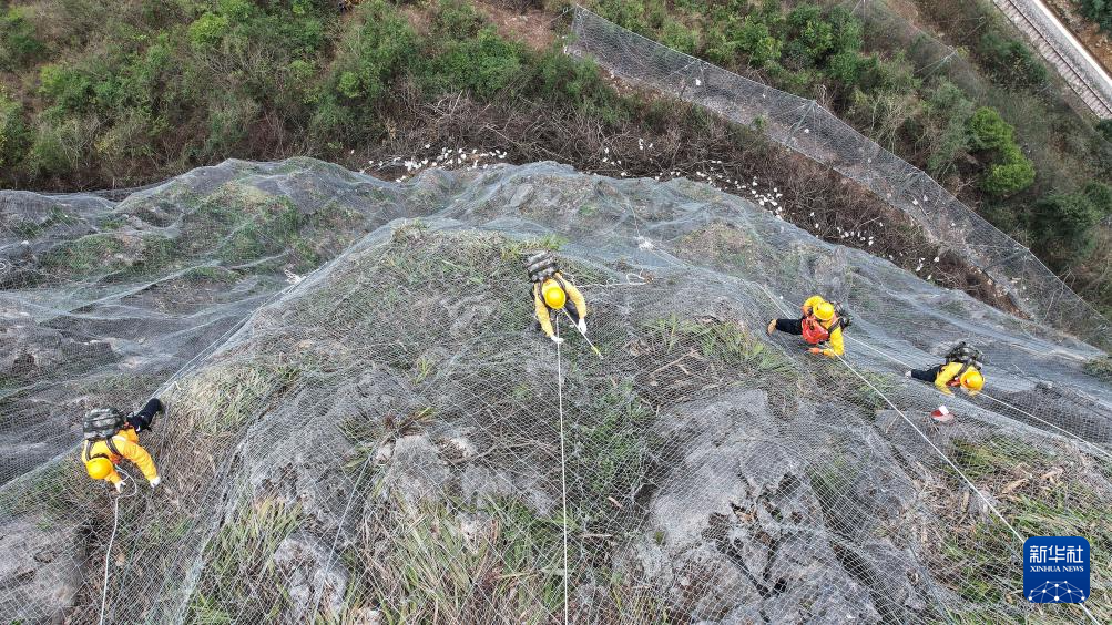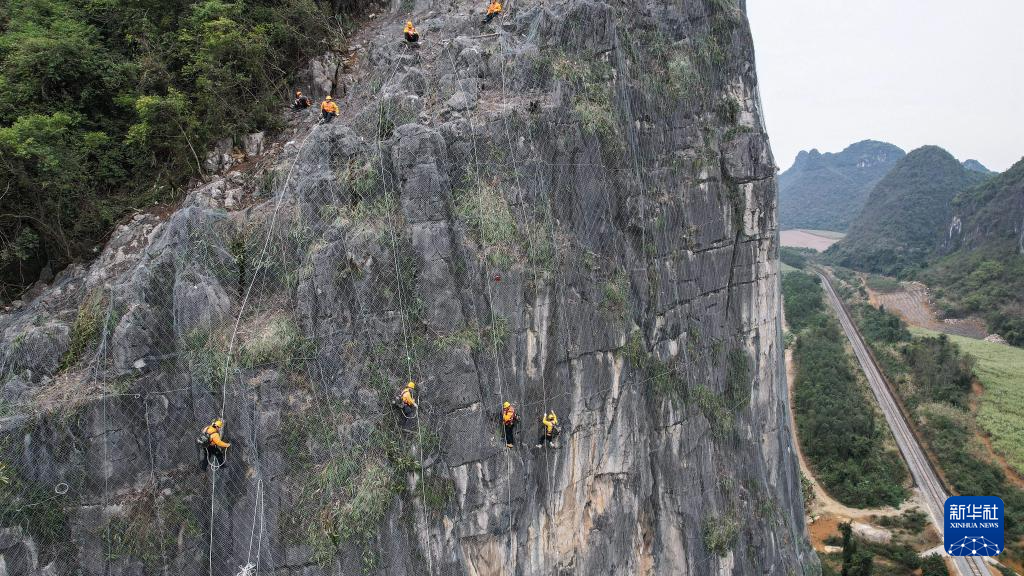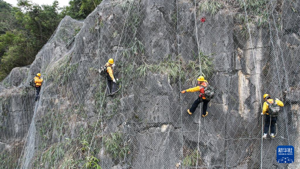 中国铁路南宁局集团有限公司的铁路工人在岩壁上攀爬,检查主动网内区域(1月25日摄,无人机照片)。