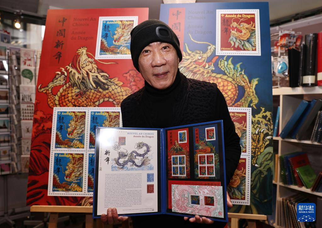 1月26日,在法国巴黎举行的发行仪式上,邮票设计者陈江洪展示龙年生肖纪念邮票。