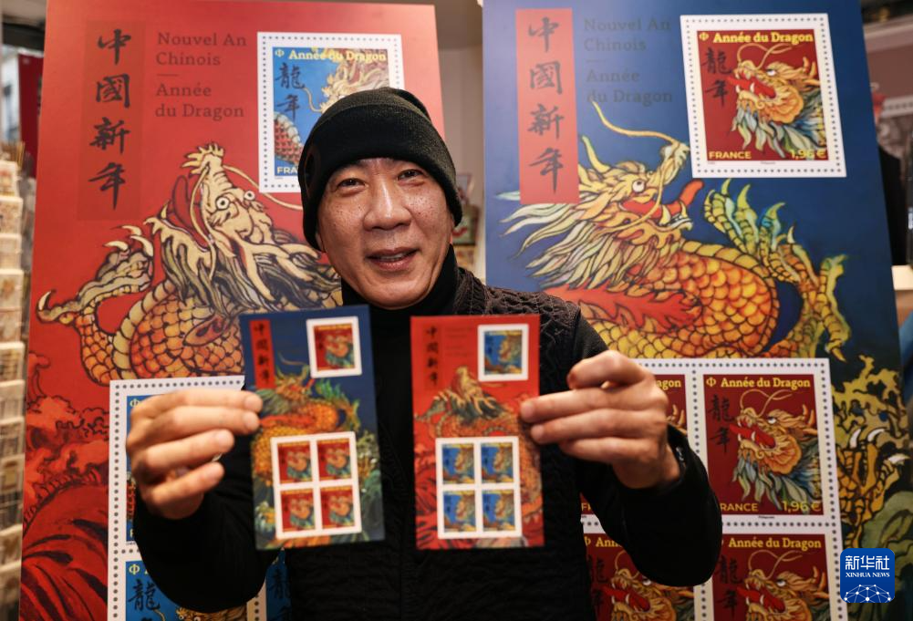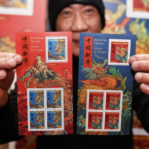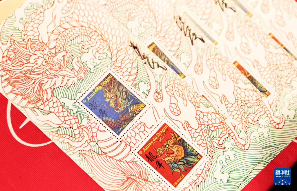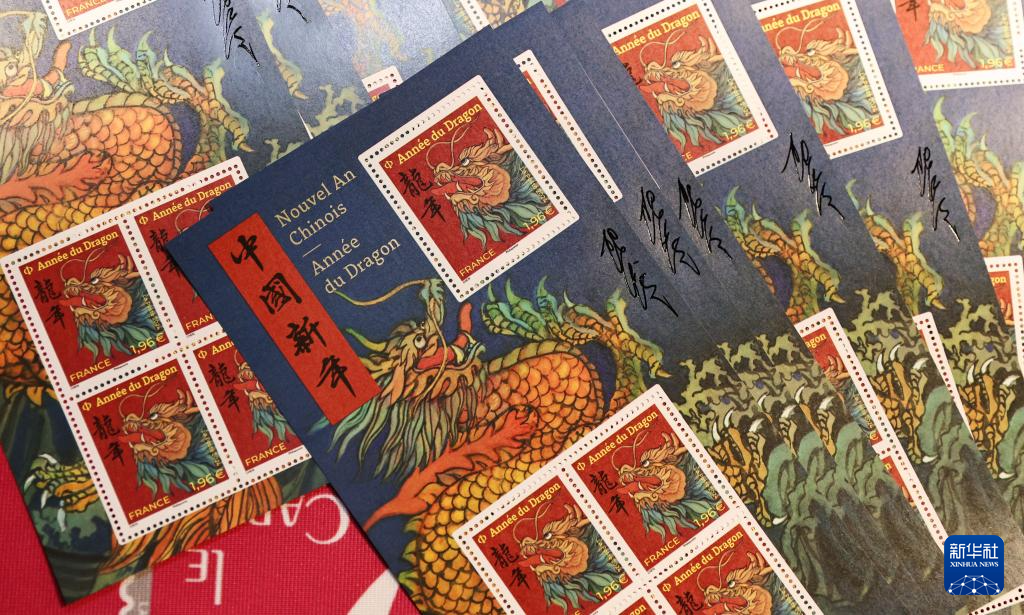 为迎接中国农历新年,法国邮政集团26日在巴黎举行中国龙年生肖纪念邮票发行仪式。中国龙年生肖纪念邮票共两款,由法国华人艺术家陈江洪设计。其中,一款邮资1.29欧元,票面是蓝色背景上绘制着一条翱翔的飞龙;另一款邮资1.96欧元,票面是红色背景衬托着一颗昂首向上的龙头。两款邮票票面上均用中文和法语书写着“龙年”字样。