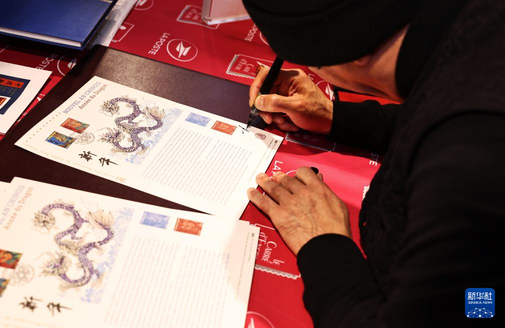 1月26日,在法国巴黎举行的发行仪式上,邮票设计者陈江洪为当地集邮爱好者签字留念。