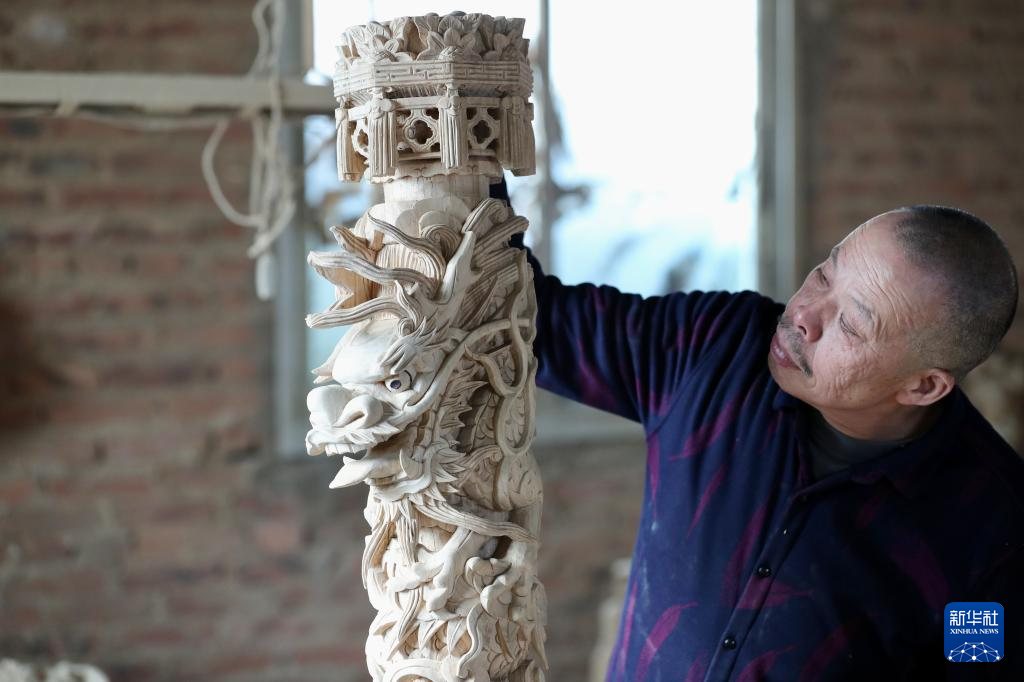 1月27日,在晋江市东石镇潘山村晋江市艺达古建筑工程有限公司车间内,工人雕刻龙柱。