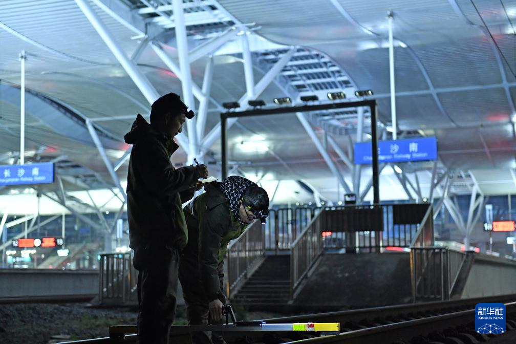 长沙南站是连接京广高铁与沪昆高铁的重要枢纽车站,长沙高铁工务段长沙南线路检查二工区主要负责长沙南站前后道岔、线路等设施设备的检查。春运期间旅客列车加开,“天窗”作业时间缩短,铁路线路工们在寒夜中完成各项检查,保障列车行驶安全。