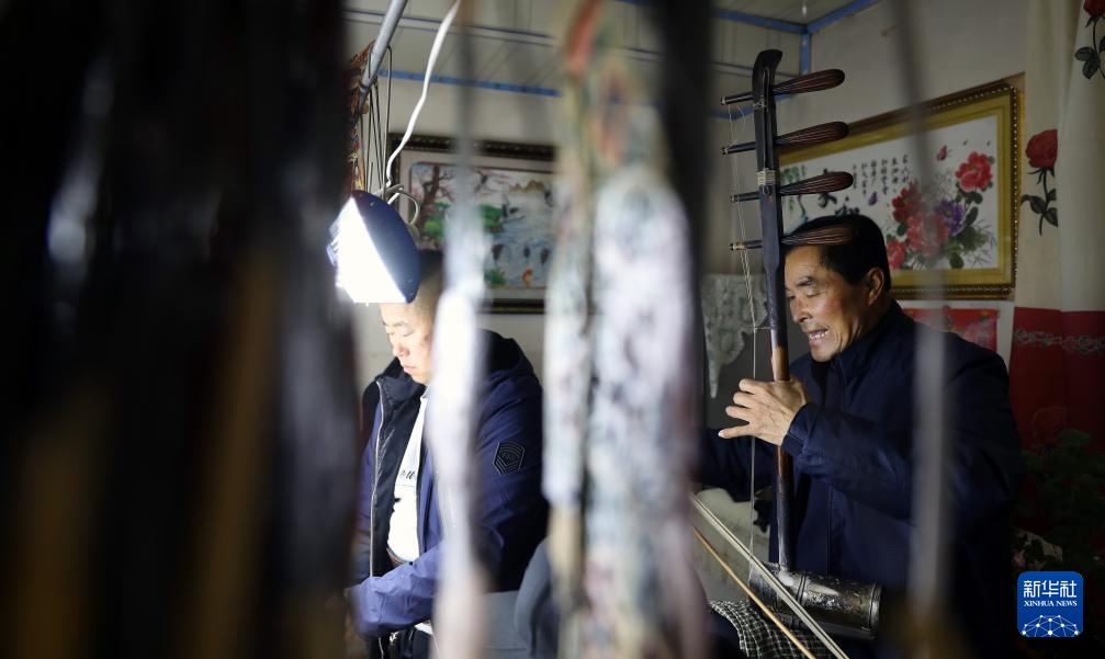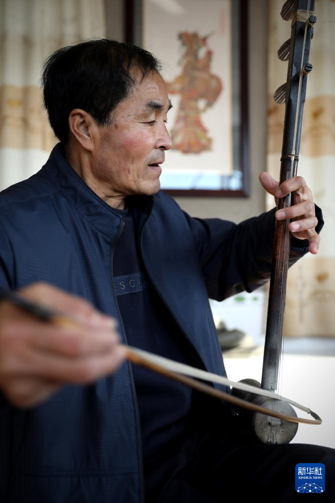 1月24日,吕正业在自己家的工作室里练习四胡演奏,四胡是皮影戏的主要伴奏乐器。